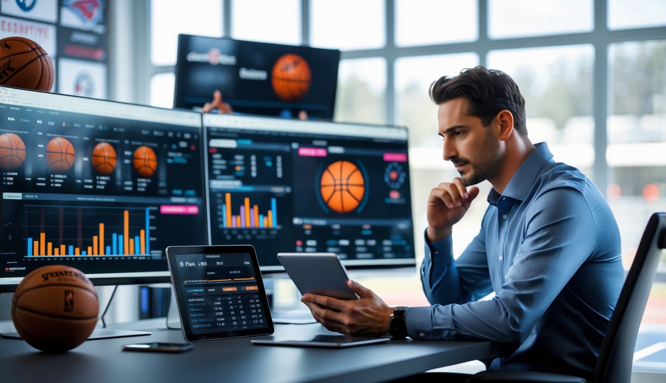 Seorang analis olahraga sedang memeriksa data statistik bola basket di meja kerja dengan beberapa monitor dan bola basket di dekatnya.